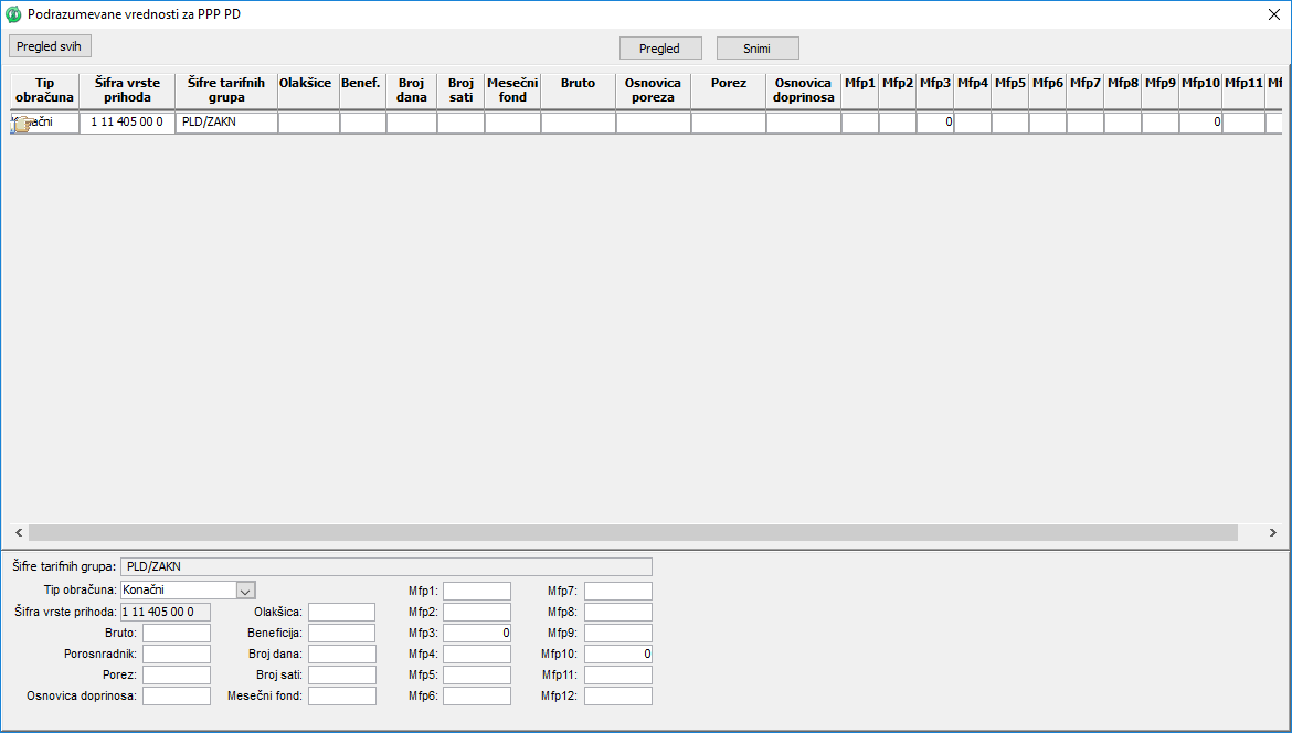 Želite da se za zakup ne popunjavaju polja mfp3 i mfp10. Selektujte red sa tarifnom grupom PLD/ZAKN, kliknite na "Podrazumevane vrednosti" i ubacite red. Program će sam povući šifru vrste prihoda (ŠVP) selektovanog reda iz kojeg ste otvorili prozor. Unesite tip obračuna "konačan" i u polja mfp3 i mfp10 unesite 0. Tako ćete omogućiti da se u PPP PD obrascu u poljima mfp3 i mfp10 uvek nalazi 0 kada je u pitanju šifra vrste prihoda nevedena u ovoj definicij tj "1 11 405 00 0".