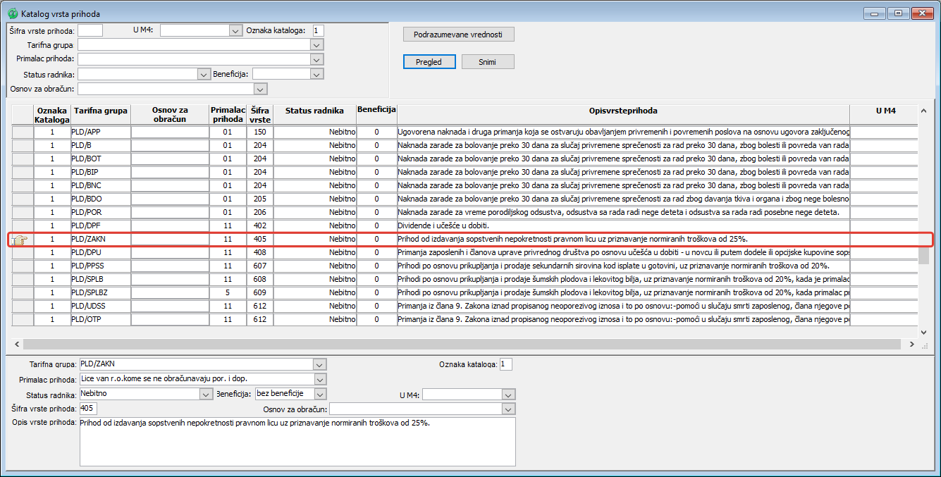 U prozoru "Katalog vrsta prihoda" vide se veze između tarifnih grupa koje se koriste prilikom obračuna u Calculusu 12 (PLD, PLD/OS,...) i šifara novih vrsta prihoda Poreske uprave. U katalogu vrsta prihoda, vrste prihoda su povezani sa dažbinama koji se koriste u obračunima. Nove vrste prihoda mogu se uneti ručno, ubacivanjem stavke i povezivanjem sa odgovarajućom tarifnom grupom.