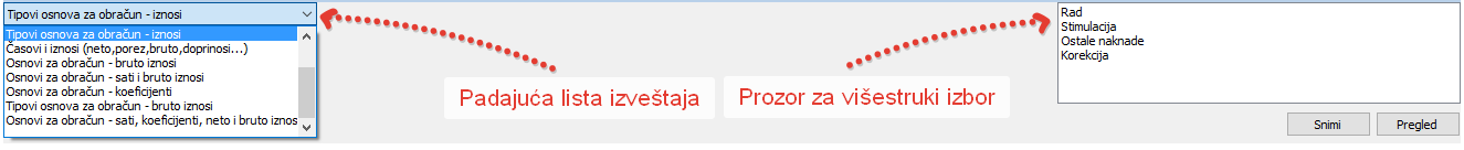 Sekcija prozora "Kreiranje izveštaja" koja sadrži padajuće liste za izbor tipova osnova i pojedinih osnova, predstavlja veoma jednostavan editor promenljivih izveštaja koji kreirate kao korisnik. Za izradu Vašeg izveštaja na raspolaganju su Vam svi tipovi osnova i osnovi koji su definisani u prozoru Osnovi za obračun do koga se dolazi izborom istoimene stavke opcije glavnog menija "Osnovni podaci - Osnovi za obračun".