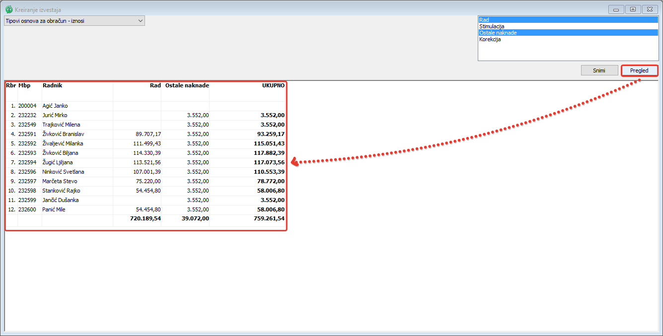 .Klikom na dugme "Pregled" izlistava se pregled koji je upravo kreiran ( vidi sliku )