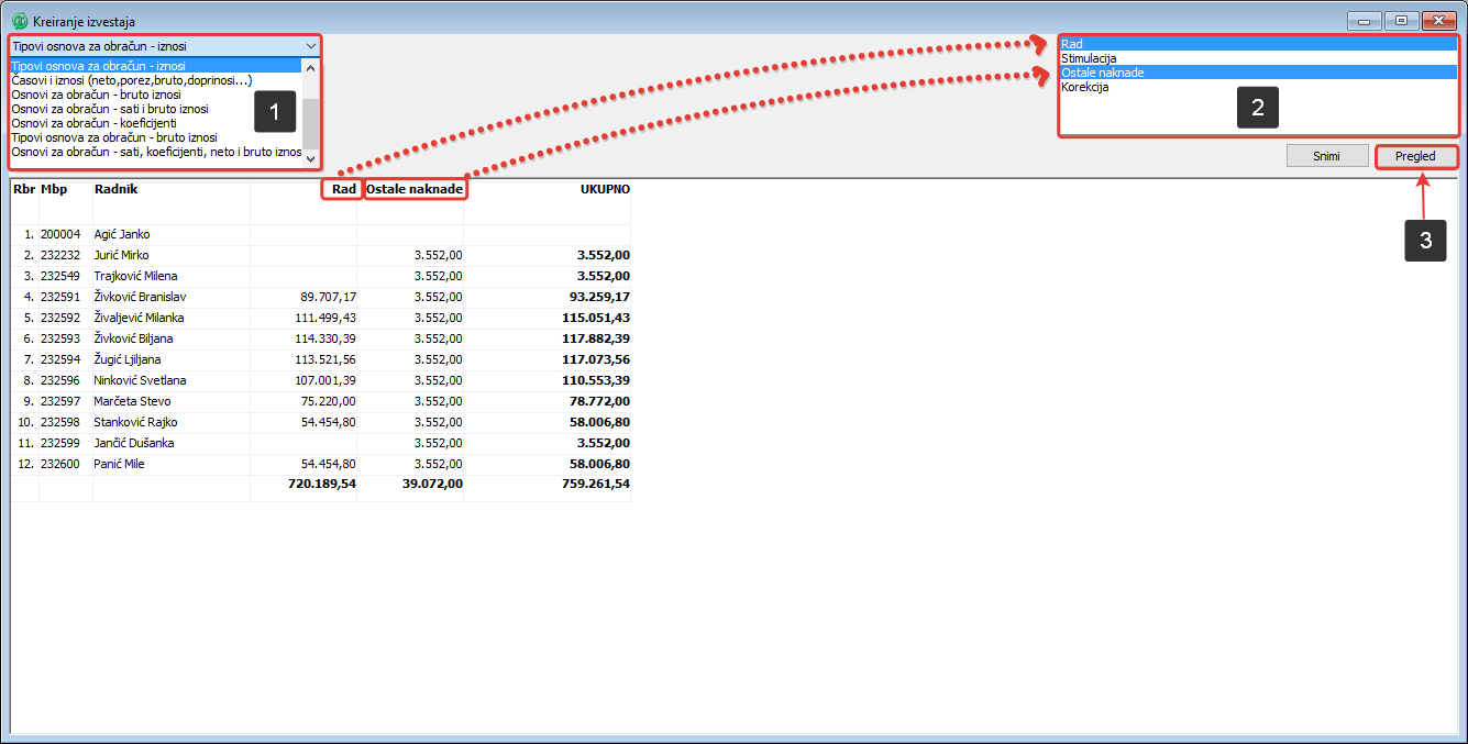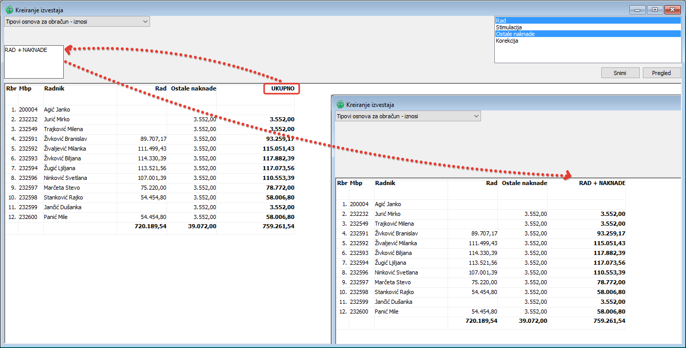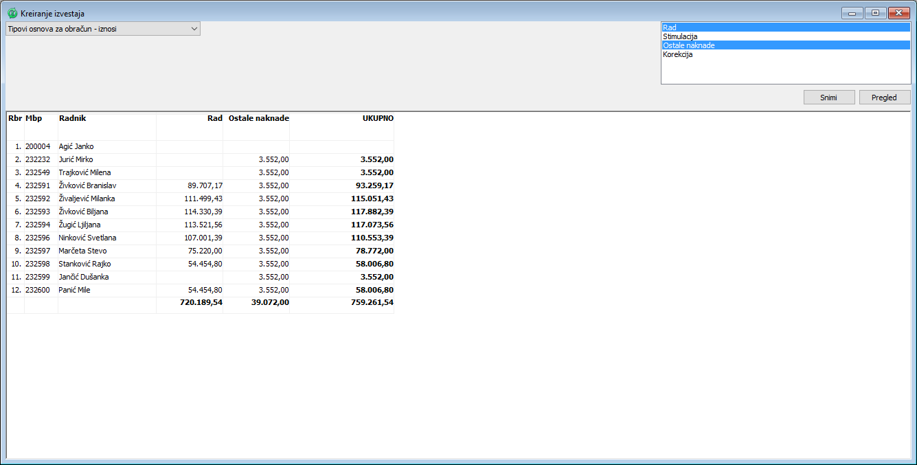 . U okviru prozora za kreiranje izveštaja moguće je kreirati niz slobodnih izveštaja po obračunima na osnovu raspoloživih tipova osnova i svih pripadajućih osnova. Kreirani izveštaj je moguće proveriti klikom na dugme Pregled i ukoliko je izveštaj kompletan i tačan može se trajno upamtiti izgled, naziv i naslov izveštaja klikom na dugme "Snimi". Kreirani izveštaj će biti automatski pridodat spisku izveštaja u prozoru "Izveštaji".