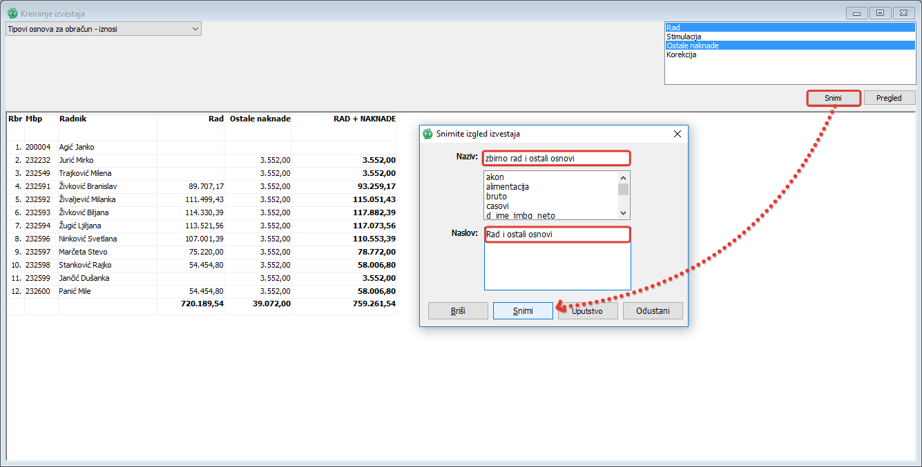 .Klikom na dugme "Snimi" otvara se podprozor "Snimite izgled izveštaja". U polje "Naziv:" bez razmaka unesite smi sl.ni naziv izveštaja i u polje "Naslov" unesite naslov izveštaja ( vidi sliku )