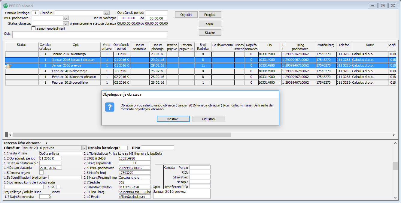 Ako vam odgovara nosilac virmana, kliknite na dugme „Nastavi“. Ovim će se formirati PPP PD obrazac koji sadrži sve stavke svih obrazaca koji se u njega objedinjuju. Objedinjeni obrasci time postaju nepromenljivi. Na spisku obrazaca prepoznaćete ih po tamnijoj boji. Glavni objedinjeni obrazac dobija status “Glavni od objedinjenih“, a ostali “Objedinjen obrazac“. Objedinjujući obrazac dobija status „zbirni obrazac“. Njega treba eksportovati i kasnije u njega importovati odgovor PU.