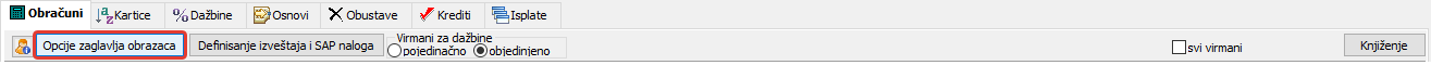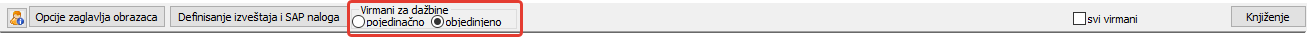 Nakon definisanja virmana za objedinjene dažbine potrebno je otvoriti prozor "Obračuni". Na zaglavlju tog prozora nalazi se opcija ""Virmani za dažbine". Da bi program kreirao jedan zbirni virman za sve dažbine, potrebno je da bude čekirana opcija "objedinjeno":