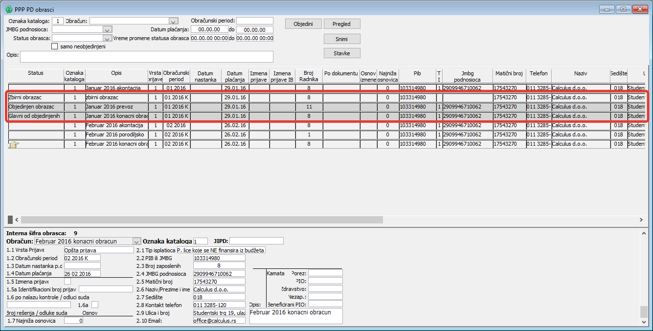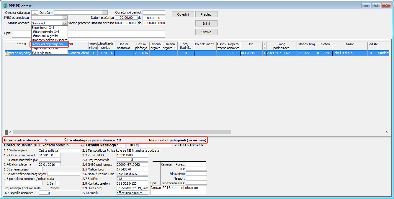 Da biste mogli da pratite koji obrasci su objedinjeni na svakom od objedinjenih obrazaca i na objedinjavajućem obrascu omogućeno vam je, da pored intrene šifre obrasca u nastavku vidite i internu šifru objedinjavajućeg obrasca. Ove interne šifre generiše Calculus 12. Kao takve, interne šifre se ne šalju Poreskoj Upravi. Podrazumeva se da se za neobjedinjene obrasce vide samo njihove interne šifre. Na slikama koje slede vidi se veze ojedinjenih obrazaca preko internih šifara: