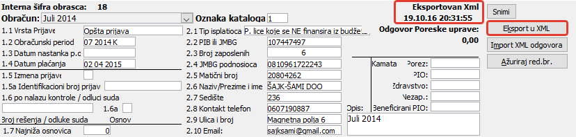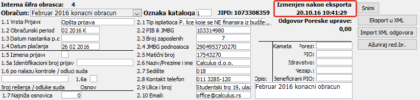 Klikom na dugme "Da", program prihvata i snima napravljene izmene. Izlaskom iz stavki obrrasca i klikom na dugme "Pregled" na formi "Obrasci", program će u koloni status upisati "Izmenjen nakon eksporta". A ta promena će se videti i na zaglavlju samog obrasca: