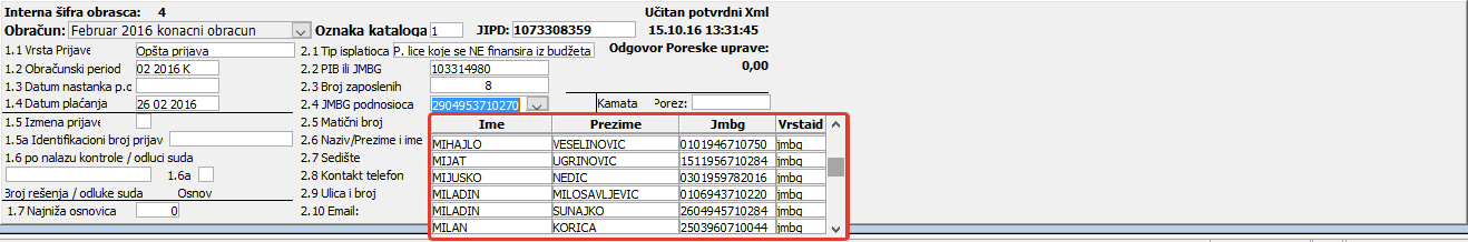 .Popuniti osnovne podatke o podnosiocu, JMBG, i izabrati opciju "JMBG" u polju pored. Klikom na dugme "Snimi" pa "Izađi", program kreira Podnosioca obrasca, ( vidi sliku )