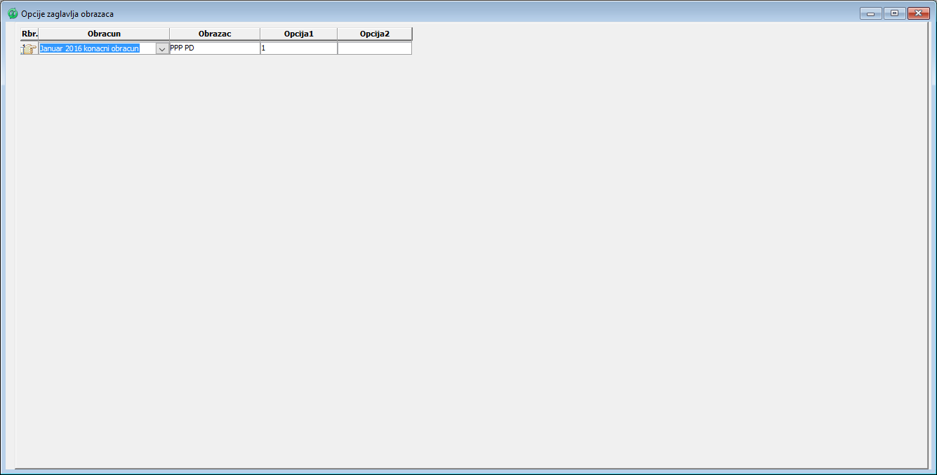, u koloni "Obračun" izaberite jedan od obračuna, u koloni "Obrazac" izaberite PPP PD obrazac i u koloni "Opcija 1" izabrati "1", ukoliko je firma isplatilac zarada pravno lice koje se ne finansira iz budžeta.