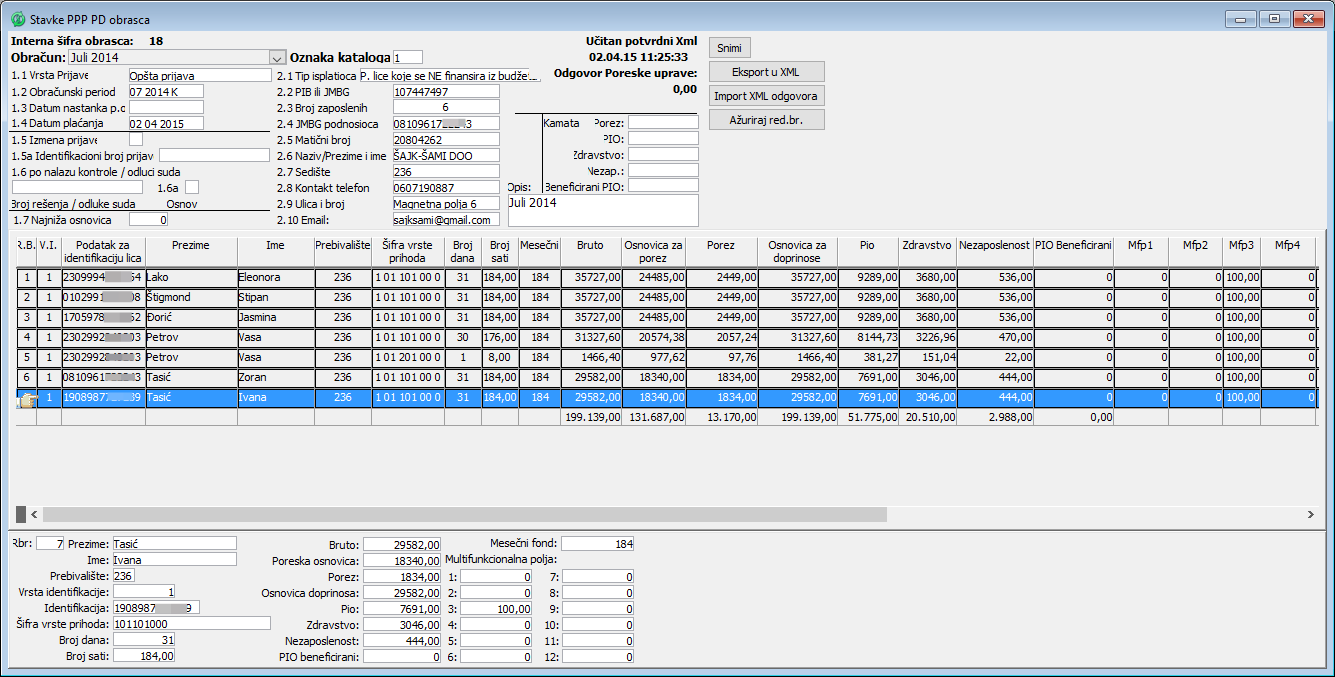 Selektovanjem radnika iz prikazanog spiska, u editoru prozora "Stavke PPP PD prijave" mogu se videti podaci o njegovoj zaradi: