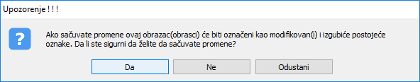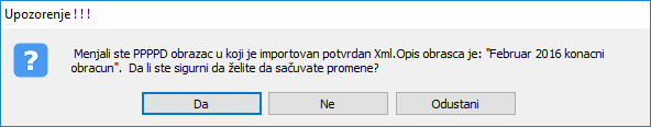 Izmena već eksportovanog obrasca je moguća ukoliko je izmena neophodna. Prilikom snimanja promena program će vas upozoriti sledećom porukom:
